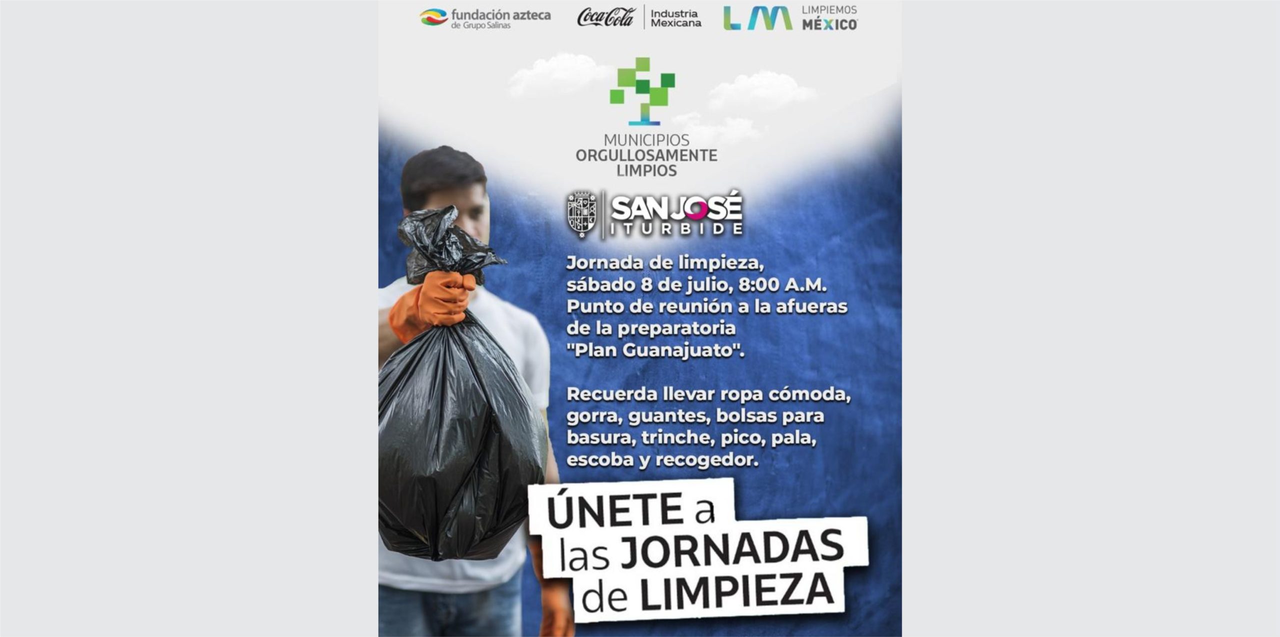 Limpiemos México” es la campaña de limpieza más grande en el país, iniciativa que involucra a gobiernos, sociedad civil y empresas; San José Iturbide participará en dicha jornada el próximo sábado 8 de julio a las 8 de la mañana, teniendo como punto de partida la preparatoria “Plan Guanajuato”, misma que convoca a funcionarios públicos y ciudadanía.