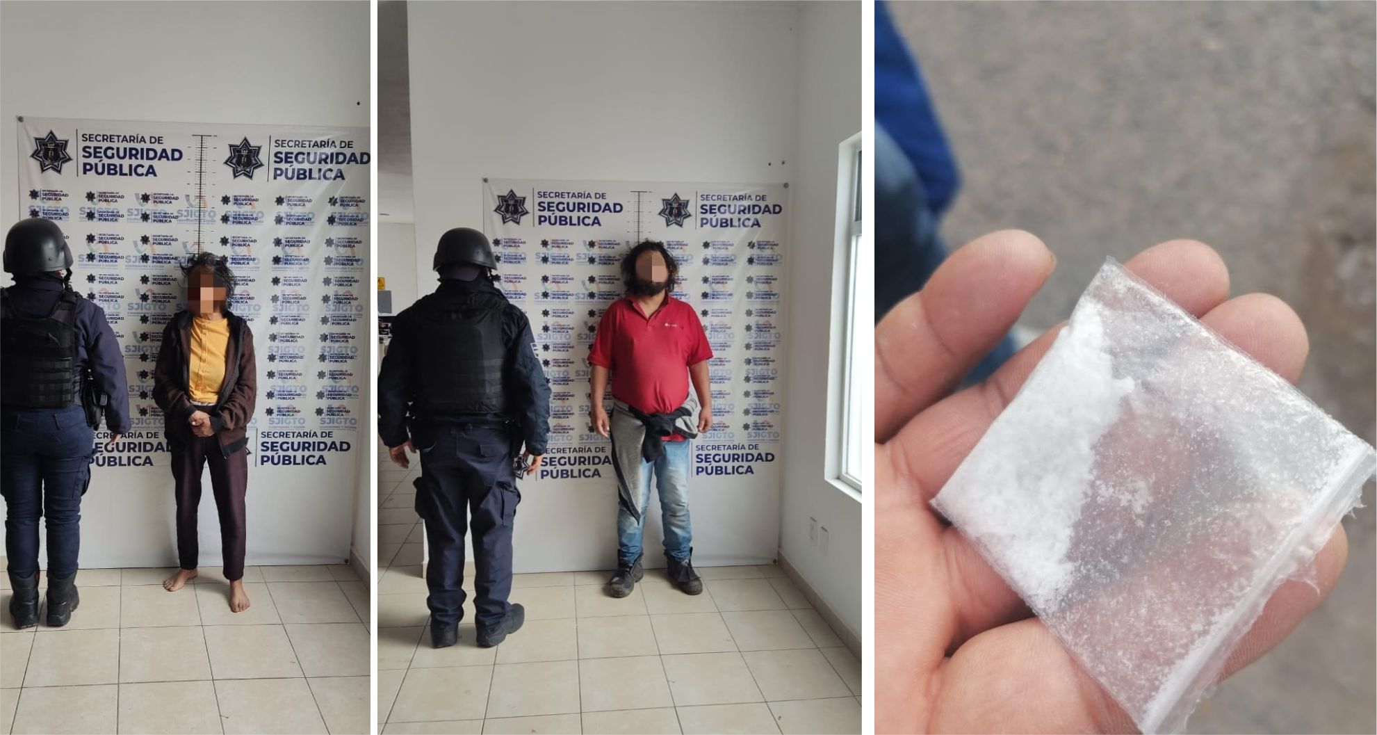 Al lugar, arribaron elementos de la Policía Municipal, quienes aseguraron y pusieron a disposición a dos personas, encontrándose entre sus pertenencias, una sustancia granulada, con características similares a la droga conocida como cristal.