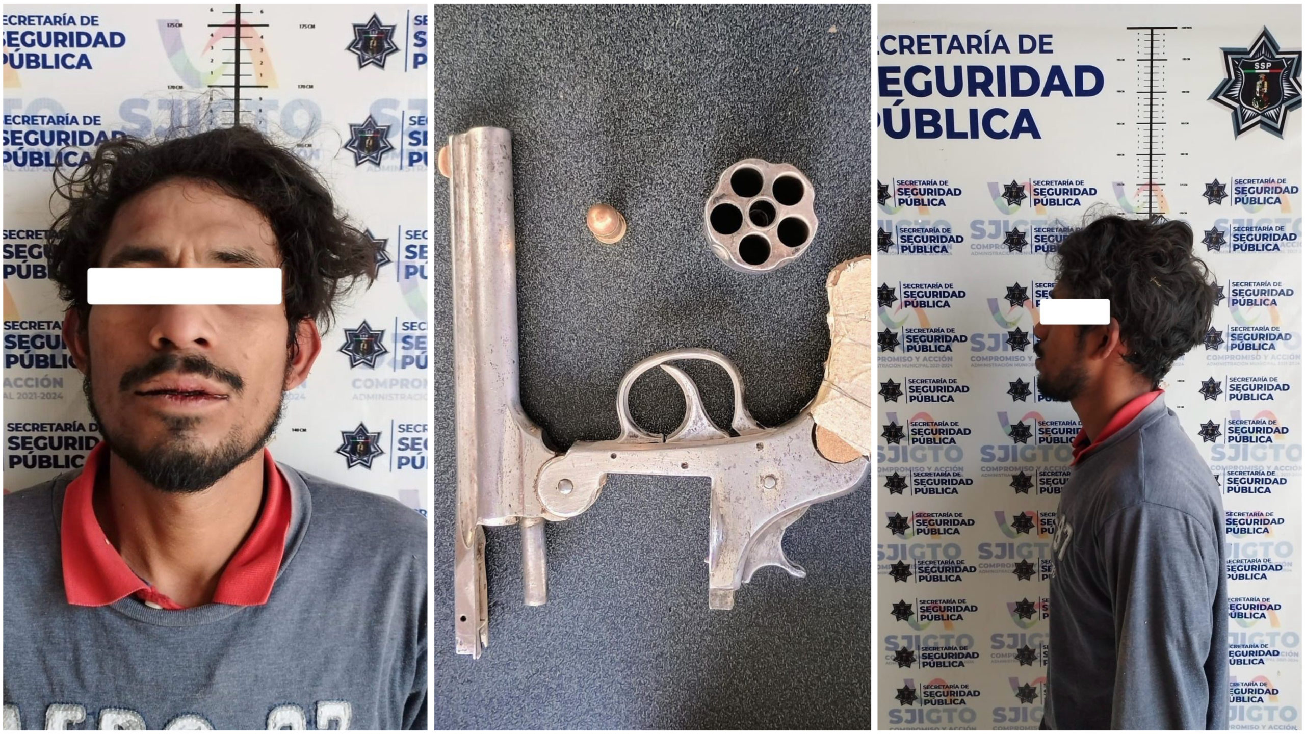 A continuación, los policías proceden a realizarle una revisión a quien se identificó como Miguel Ángel “M”, a quien le hallaron un arma tipo revólver fajada en la cintura, dicha pistola es calibre ‘38 , abastecida con un proyectil.